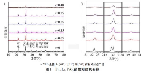 由納米粒子Bi1-xLaxFeO3的 XRD 圖( 見圖 1) 可知,純BiFeO3樣品的衍射峰與六方晶系 R3c 結 構BiFeO3標準圖卡( JCPDS 86-1518) 一致,此外未 見雜質衍射峰,證明樣品為純相的鈣鈦礦結構 BiFeO3 . 當 摻 入 La 3 + 之 后,樣 品 在 31. 7° 附 近 的( 104) 和 38. 9° 附近的( 006) 衍射峰消失,同 時( 012) ,( 110) 和( 202) 衍射峰隨 La 摻雜濃度 的增大不斷向高角度方向偏移,表明Bi1-xLaxFeO3 從六方晶系 R3c 結構向正交晶系 Pbnm 結構轉 變,整個過程并未出現雜質相,這是由于等價 摻雜的 La 3 + 離子略小于 Bi 3 + 離子( 八配位離子半 徑分別為 0.130 和 0.131 nm) ,小于 1% 的離 子半徑差異使得僅需通過 FeO6 八面體的輕微調 節即可 使 晶 體 由 R3c 結構轉變為更加穩定的 Pbnm結構. 因此,即使在較高的 La 摻雜濃度下, 產物仍得以保持純相; 小尺寸離子的取代使得晶 面間距減小,表現為衍射峰向高角度方向移動, 類似 的 衍 射 峰 移 動現象與文獻 關 于 Bi1-xGdxFeO3的報道一致。