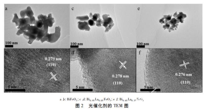 由Bi1-xLaxFeO3 ( x = 0,0. 05 和 0. 35) 的 TEM 圖( 見圖 2) 可知,3 個光催化劑樣品均為不規則 顆粒,隨著 La 摻雜濃度的增大,催化劑粒子的尺寸減小,表明離子摻雜具有抑制晶粒生長的作用. 高分辨 TEM 圖( 見圖2b) 顯示,純BiFeO3內 一組晶格條紋的間距為 0. 279 nm,與 R3c 結構 BiFeO3的 XRD 標準卡( JCPDS 86-1518) 的( 110)。