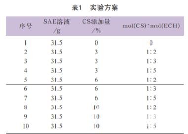 SAE溶液原液的固含量為31.75%,每次實驗均使 用絕干質(zhì)量為10g的S A E,即溶液質(zhì)量31.50g。分別配 制不同質(zhì)量百分比的C S和不同摩爾質(zhì)量比的E C H與 S A E反應制得改性施膠劑,C S質(zhì)量均為S A E溶液絕干 質(zhì)量的3%、6%、10%,C S與E C H的摩爾質(zhì)量分數(shù)比分 別為1∶2、1∶3、1∶5。具體方案設計如表1所示。