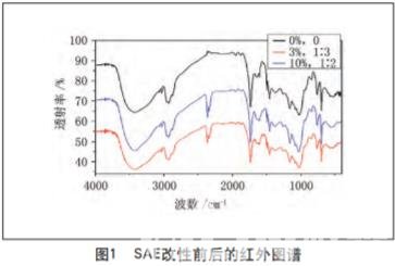 圖 1中 分 別 是 添 加 C S 量 為 0 % 、3 % 、1 0 % , 并且添加 E C H為 0、m o l (C S)∶m o l (E C H )=1∶2、 mol(CS)∶mol(ECH)=1∶3的紅外圖譜。無CS和ECH添 加的樣品,即改性前實驗室制備的S A E乳液。通過對比 分析,改性前后的聚合物紅外圖譜基本一致,即改性前 后的聚合物功能基團一致。C S中含有胺基(-N H2), S A E中含有叔胺,E C H作為交聯(lián)劑易與胺基(-N H2) 和叔胺發(fā)生交聯(lián)反應、季胺化反應,生成了叔胺和季銨 鹽。改性后的聚合物圖譜中沒有出現(xiàn)C S的-N H2振動 峰,環(huán)氧基團也不存在振動峰。圖譜結(jié)果基本能表明 CS、ECH都和基體SAE發(fā)生了交聯(lián)反應。 2.2 乳液的基本物性 改性后乳液固含量測定后,通過計算,使用蒸餾水 將所有乳液的固含量統(tǒng)一調(diào)制成為31.75%,對調(diào)制后 的乳液進行pH值、黏度檢測,結(jié)果如表2所示。 與原S A E相比,改性后表面施膠劑的p H值、黏度 稍有增加。這與聚合物改性引入胺基、生成叔胺和季 胺,生成網(wǎng)狀聚合物有關。結(jié)果表明改性后的乳液p H 值、黏度變化不顯著。