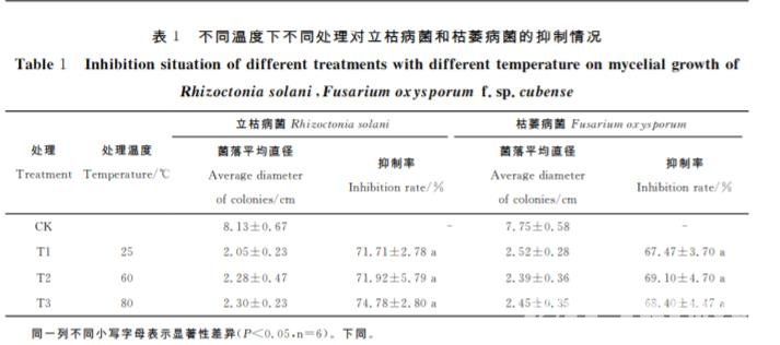 由表1可知,不同溫度處理的弗氏鏈霉菌 K- 7發(fā)酵液上清對(duì)黃瓜立枯病菌、香 蕉 枯 萎 病 菌 均 有不同程度的抑制作用,比較 T1、T2、T3三個(gè)溫 度處理后對(duì)立枯病菌和枯萎病菌的抑制率均無(wú)顯 著差異,抑制率沒(méi)有明顯變化,說(shuō)明發(fā)酵液上清經(jīng) 60和80 ℃處理后,其中的抑菌物質(zhì)活性沒(méi)有明 顯變化,說(shuō)明其抑菌物質(zhì)對(duì)80 ℃高溫較為穩(wěn)定。
