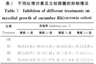 由表2可知,不同處理的弗氏鏈霉菌 K-7發(fā) 酵液上清對(duì)黃瓜立枯病菌均有不同程度的抑制作 用,比較同一 稀 釋 梯 度 抑 制 率,可 以 看 出 K-7發(fā) 酵液上清和高濃度亞磷酸二氫鉀復(fù)配(T2)后,對(duì) 絲核菌的抑制效果顯著優(yōu)于單獨(dú)上清液(T3),二 者顯著優(yōu)于單獨(dú)的亞磷酸二氫鉀(T1)處理,說(shuō)明 發(fā)酵液上清中的抑菌物質(zhì)對(duì)高濃度亞磷酸二氫鉀 較為穩(wěn)定。