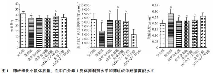 與空白組相比,造模后的小鼠體質量顯著降 低,小鼠肺纖維化模型組血清中 IL-1RA 水平明顯 降低,肺組織中 Hyp 含量明顯升高(P<0.01)。與肺 纖維化模型組相比,蟲草菌粉組、蟲草總多糖組、 蟲草多糖(MW<2×105 )組的血清中 IL-1RA 水平均 明顯升高(P<0.05,P<0.01),肺組織中 Hyp 的含量 均明顯降低(P<0.05,P<0.01)。結果見圖 1。