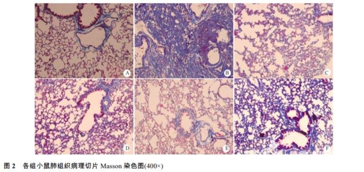 肺組織在 Bouin 液中固定 24 h 后梯度乙醇脫水,二甲苯透明,浸蠟,石蠟包埋,常規切片,行Masson 染色,觀察膠原沉 積,使用 Motic Med 6.0 數碼醫學圖像分析系統檢 測肺纖維化面積。
