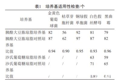 被檢與對照培養基菌落平均數的比值均在 0.5 ~ 2 范圍內,且菌落形態大小與對照培養基的菌落一致(表 1),說明培養基適用性檢查符合要求。