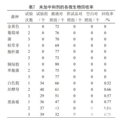 鹽酸莫西沙星對細菌的抑菌活性較強,檢測需氧菌 總數時需要添加合適的中和劑抑制其自身的抗菌活性 ; 白色假絲酵母和黑曲霉的回收率在 0.5 ~ 2.0 之間(表 2), 符合藥典規定要求,表明可直接進行霉菌和酵母菌的微生物限度檢測。