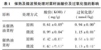 分別稱取未催熟及適當催熟的油菜籽 50 g,平 鋪于直徑為 9 cm 的玻璃平皿中。設定微波爐頻率 2 450 MHz、微波功率 800 W,對油菜籽微波處理 7 min 后,取出樣品自然冷卻至室溫。隨后投入低 溫壓榨機內進行壓榨,收集菜籽油,于 8 000 r/min 下離心 15 min,清油封存于 4 ℃ 冰箱備用。同時將 未經微波預處理的油菜籽直接低溫壓榨制備菜 籽油。