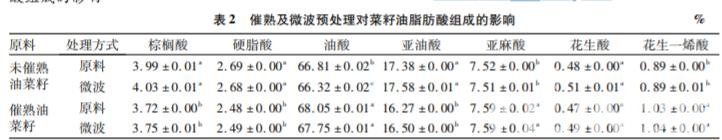 由表 2 可知,催熟雖然不會改變菜籽油的脂肪 酸組成,但在含量上存在較大差異( P < 0. 05) 。而 微波預處理則對脂肪酸組成及含量整體未產生顯著 影響( P > 0. 05) ,油酸、亞油酸等不飽和脂肪酸也較 為穩定。Oomah 等對大麻籽進行不同程度的微波預處理,發現其脂肪酸組成無變化。吳雨等也 利用此手段加工米糠,結果表明米糠油脂肪酸組成 不受微波預處理的影響。