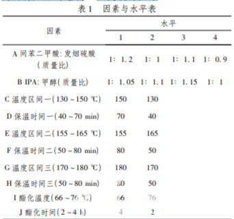 運用正交設計,將 w( SO3 ) = 65% 的發煙硫酸 一次性加入三口瓶,攪拌狀態下加入間苯二甲酸用 量的 20% ~ 30% ,在 20 ~ 30 min 內將物料溫度提高 到 115 ~ 125 ℃,再將剩余的間苯二甲酸全部加入三 口瓶,并加入少量的無水硫酸鈉。然后分以下三個溫度區間進行: 將物料溫度升高至 130 ~ 150 ℃ 時,加入硫酸鎘,保溫反應 40 ~ 70 min,然后在 30 ~ 45 min 內物料溫度升高至 160 ~ 169 ℃,先保溫反應 20 ~ 30 min,加入 SiO2,再保溫反應 50 ~ 80 min; 最 后在 20 ~ 50 min 內將物料溫度升高至 170 ~ 180 ℃,先保溫反應 30 ~ 40 min,加入硫酸汞,保溫反應 50 ~ 80 min。反應時加料質量比例為間苯二甲酸∶ 發煙硫酸∶ 硫酸鎘∶ SiO2 ∶ 硫酸汞∶ 無水硫酸鈉 = 1 ∶ 0. 900 ~ 0. 891 ∶ 0. 0003 ~ 0. 001 ∶ 0. 0005 ~ 0. 0012∶ 0. 0005 ~ 0. 0015 ∶ 0. 001 ~ 0. 01。將磺化 反應后的物料在 1. 5 ~ 2 h 內降溫至 110℃ 以下,加 入甲醇用量的 20% ~ 30% ,待釜溫降至 85 ℃ 以下 后加入剩余的甲醇。在溫度 66 ~ 76 ℃ 酯化反應 2 ~ 4 h,酯化反應時甲醇的加料質量比為間苯二甲 酸∶ 甲醇 = 1∶ 1. 05 ~ 1. 1,酯化反應后的物料加水 溶解,水的加料質量比為間苯二甲酸∶ 水 = 1∶ 5. 35 ~ 5. 65,降溫至 25℃ 以下,在 25 ℃ 左右加堿調節 pH 值為 6. 5 ~ 7. 5,繼續攪拌 80 ~ 120 min,然后離 心脫水、溶解脫色、過濾、結晶提純和烘干,得到產 品。其中,離心脫水脫出的離心母液可作為酯化反 應后的溶解劑,加料質量比為間苯二甲酸∶ 離心母 液 = 1∶ 5. 35 ~ 5. 65。進行差熱分析,紅外,紫外,檢 測所得產品的結構。正交設計如下。