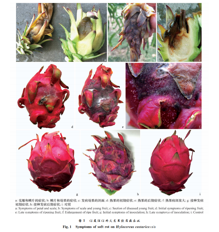 對健康的紅皮 深 紅 肉 火 龍 果 果 實 進 行 接 種,以 無菌的 PDA 為對照,5d后針刺傷接種的果實全部 發病,接種產生的癥狀與田間發病的癥狀相同(圖 1g~h),而對照果實不發?。▓D1i)。對發病組織進 行再分離,可得到與原分離株相同的病原菌,符合柯 赫氏法則,證明接種菌為火龍果軟腐病的致病菌。