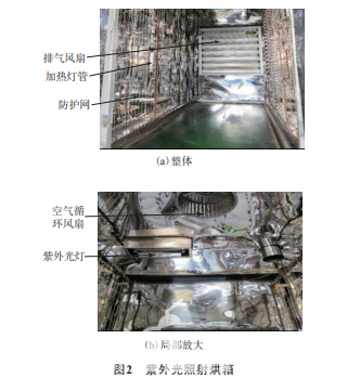 為橡膠密封條光觸媒除味設計的真空烘箱(上海精宏DZF-6090)如圖2所示,該烘箱的紫外光照射強度遠遠高 于正常太陽光的紫外光強度,且適應橡膠密封條 的批量處理。烘箱中加熱燈管保證烘箱處于一定 的溫度范圍內(nèi),空氣循環(huán)風扇保證空氣循環(huán)和烘 箱內(nèi)溫度分布均勻,紫外光燈分布在烘箱頂部和 兩側(cè),保證橡膠密封條在處理過程中被全面照射, 提高處理效率。
