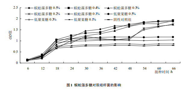 蜈蚣藻多糖對雙歧桿菌的增殖具有顯著的促進作用,但是從0.3%濃度到0.5%濃度的增長,沒有提升對 雙歧桿菌增殖的促進作用,可見在此范圍內蜈蚣藻多 糖濃度與益生效應沒有明顯的相關關系,但蜈蚣藻多 糖的促進作用顯著優于低聚果糖。因此,蜈蚣藻多糖 具有較好益生效應。蜈蚣藻多糖對雙歧桿菌增殖的促 進作用與濃度在一定范圍內具有一定正向關系,如果 經過進一步的實驗驗證,可以被開發為一種新的、更為 高效的益生元,調節人體的免疫力、增強體質,或者作 為雙歧桿菌的促生長因子而應用于酸奶的發酵工業 中。