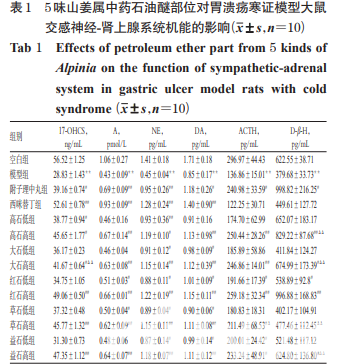 知母、高良姜、大高良姜、紅豆蔻、草豆蔻、益智飲片 (批號(hào)分別為 150601、160101、170912、160605、170801、 170718)均購自南寧生源中藥飲片有限責(zé)任公司,經(jīng)廣 西中醫(yī)藥大學(xué)中藥鑒定學(xué)教研室田慧教授鑒定為真品。 附子理中丸(陽性對(duì)照,北京同仁堂科技發(fā)展股份 有限公司制藥廠,批號(hào):15010241,規(guī)格:每 100 粒重 10 g);西咪替丁片(陽性對(duì)照,廣東華南藥業(yè)集團(tuán)有限公 司 ,批 號(hào) :150802,規(guī) 格 :0.2 g);17- 羥 皮 質(zhì) 類 固 醇 (17-OHCS)、腎上腺素(A)、去甲腎上腺素(NE)、多巴胺 (DA)、促腎上腺皮質(zhì)素(ACTH)、多巴胺-β-羥化酶 (D-β-H)試劑盒(上海酶聯(lián)生物科技有限公司,批號(hào)分別 為 RA20057、RA20337、RA20557、RA20050、RA20014、 RA20218);乙醇、乙酸乙酯等試劑均為分析純,水為蒸 餾水。