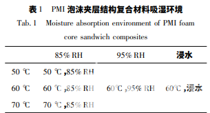 4) 在溫度小于 60 ℃,非浸水環(huán)境中,PMI 泡 沫夾層結(jié)構(gòu)復(fù)合材料的飽和吸濕率可以通過相同 條件下面板和 PMI 泡沫的吸濕率進(jìn)行預(yù)測。