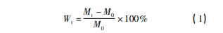 利用恒溫恒濕箱,使面板復(fù)合材料、PMI 泡沫 和 PMI 泡沫夾層結(jié)構(gòu)復(fù)合材料試樣在相應(yīng)環(huán)境 中持續(xù)吸濕。在吸濕的前 24 h,每 12 h 對其吸濕 率 Wt 進(jìn)行測試; 24 h 后,每 24 h 對吸濕率 Wt 進(jìn) 行測試。本文使用稱量法表征試樣的吸濕率 Wt ( 見式 1) 。