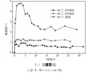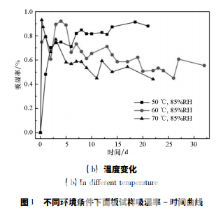 圖 1 為面板復(fù)合材料試樣在不同吸濕環(huán)境中 的吸濕率 - 時間曲線。從圖中可見,五種吸濕環(huán) 境中,面板復(fù)合材料的大部分吸濕都集中在吸濕 初期的 24 h 內(nèi),即吸濕初期吸濕率快速增加,隨 后吸濕率有所波動,最終都到達(dá)平衡。不同濕度 環(huán)境中( 見圖 1( a) ) ,面板復(fù)合材料的吸濕行為 相差很大,環(huán)境的濕度越大,試樣的吸濕速率和飽 和吸濕率也越大,85% RH、95% RH 和浸水三種濕 度下面板的飽和吸濕率分別為 0. 57% 、1. 18% 、 2. 36% 。同時發(fā)現(xiàn),在高濕度環(huán)境 85% RH、95% RH 中,面板復(fù)合材料的吸濕率波動較小,而浸水 環(huán)境中面板復(fù)合材料的吸濕率有明顯的下降,這 是由于浸水環(huán)境更為惡劣,浸水對面板復(fù)合材料 的損傷更大,使試樣表面溶解和剝落等質(zhì)量損失 的程度和范圍大于高濕度環(huán)境,且面板復(fù)合材料 本身質(zhì)量較小,在吸濕率曲線上表現(xiàn)為吸濕率顯 著下降。不同溫度環(huán)境中( 見圖 1 ( b) ) ,面板復(fù) 合材料的吸濕率曲線更加相近,吸濕速率沒有明 顯的規(guī)律,吸濕后期都有部分波動,其中 70 ℃ 時 面板復(fù)合材料的吸濕率下降最多,其次為 60 ℃環(huán) 境下的,50 ℃ 環(huán)境下試樣的吸濕率穩(wěn)定上升,沒 有明顯的下降過程。這可能是因?yàn)榄h(huán)境溫度越 高,吸濕過程中材料的剝離、脫粘等不可逆損失越 多。最終50 ℃、60 ℃、70 ℃三種環(huán)境中面板復(fù)合 材料 的 飽 和 吸 濕 率分別為 0. 85% 、0. 57% 、 0. 51% ,三個飽和吸濕率較為接近。與環(huán)境溫度 相比,濕度對面板復(fù)合材料吸濕行為的影響更大。