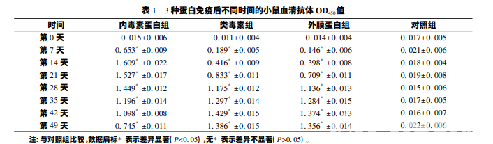采用間接 ELISA 法檢測(cè) 3 種蛋白免疫組和對(duì)照 組小鼠血清抗體水平,結(jié)果 3 種蛋白免疫后小鼠血清 抗體效價(jià)均隨免疫進(jìn)程持續(xù)升高,免疫組與對(duì)照組差 異顯著( P<0. 05) ,見表 1。