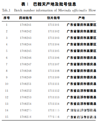 ShimadzuCorporationLC-20AT 高 效 液 相 色 譜儀,SartouiusCPA225D 分 析 天 平,水 循 環(huán) 真 空 泵,SENCOTechnologyCo.Ltd.提供;JM-A5002電 子天平,浙江余姚市紀(jì)銘稱重校驗設(shè)備有限公司提 供;DHG-9140A 干燥箱,上海精宏儀器設(shè)備有限公司提供;KQ-500DE超聲波清洗器,江蘇昆山舒美超聲儀器有限公司提供。 耐斯糖對照 品,批 號 為111891-201403;水 晶 蘭 苷 對 照 品,批 號 為 111870-201303;乙 腈,批 號 為 20161014;甲醇,色譜純,批號為20161020;水,純化 水;磷酸,分析純。 巴戟天藥材共計15批,經(jīng)河北省藥品檢驗研究院孫寶惠老師鑒定為正品,樣品來源信息見表1。