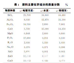 實驗使用的電鍍污泥是采自常州某表面技術科技發展有限公司經常規方法脫水后的污泥,含水率 為74.90%。將采來的電鍍污泥置于烘箱里105 ℃ 烘干24h,將烘干的電鍍污泥采用球磨機磨細,并 過200目(篩孔尺寸0.075mm)標準篩。粉煤灰取 自常州華電電廠,采集來的粉煤灰未經球磨機粉磨 直接烘箱干燥后使用。水泥采購市場上的商用325 普通硅酸鹽水泥,實驗原料經過 X 射線熒光光譜表 征分析,主要組分見表1。