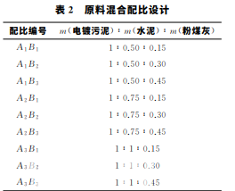 圖1為本實驗的試塊制備的工藝流程圖。將磨細烘干 的電鍍污泥、水泥與粉煤灰按比例稱重后,再經球磨機粉磨 混合,球磨機的轉速為350r/min,混合時間為6h。表2為實 驗 原 料 配 比 設 計。以 電 鍍 污 泥 的 質 量 為 參 照,記作1個質量單位,根據水泥固化相關中水泥使用 量,水泥的添 加 量(A)為 電 鍍 污 泥 的 0.50,0.75,1 倍,則 A1,A2,A3 分別為0.50,0.75,1。粉煤灰的添加量不能多 于水泥,否則會嚴重影響試塊的抗壓強度,本研究中粉煤灰 的添加量(B)為電鍍污泥添加量的0.15,0.30,0.45倍,即 B1,B2,B3 分別為:0.15,0.30,0.45。將處理好的樣 品 加 入 一 定 量 的 水(質 量 分 數 為8%~ 10%)使 其 成 流 塑 態 后,以 內 徑 d =39.1 mm、高 h = 80mm 水泥膠砂試模制作 試 塊。試 塊 制 作 過 程 中 分3層 夯實,每層用擊實器擊24次,試塊成型時間為1d;養護時 間(C)為3,5,7,14,21d,養護完成取出測其無側限抗壓強 度和重金屬浸出毒性。其中,養護溫度(20±1)℃,養護濕 度≥90%。