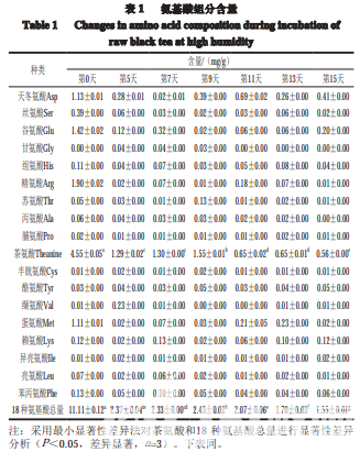 氨基酸是茶湯呈味物質的主要構成之一,口感主要 體現為鮮爽味,氨基酸含量的高低對茶湯鮮爽味的呈現 起著很大的作用。如表1所示,氨基酸總量隨著霉變時間 的延長而逐漸降低,在霉變之初0~5 d降低最快,降低率 約為80.23%。茶氨酸為測定的18 種游離氨基酸組分中含 量最高的一類氨基酸,未霉變時約占游離氨基酸總量的 40.92%。在未霉變黑毛茶樣本中,含量前5的氨基酸組分 為茶氨酸、精氨酸、谷氨酸、天冬氨酸和蛋氨酸,霉變 第15天時排名前5的氨基酸組分為茶氨酸、天冬氨酸、谷 氨酸、賴氨酸、苯丙氨酸。精氨酸和蛋氨酸含量在霉變 過程中降解速度很快,說明精氨酸較容易成為霉菌的氮 源而被霉菌所利用轉化。在18 種氨基酸組分中僅酪氨酸 含量略有增加,未見因霉菌生化代謝轉化而導致某類氨 基酸含量明顯上升的現象。采用最小顯著性差異法對茶 氨酸和18 種氨基酸總和在不同霉變時期的含量進行差異 顯著性分析。結果表明:茶氨酸從霉變起始至霉變第5天 時含量變化呈顯著性差異(P<0.05);18 種氨基酸總量 從霉變起始到霉變第7天時含量變化呈顯著性差異,霉變 第9~15天含量變化呈現顯著性差異。