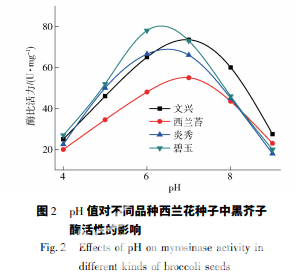 選取 4 種不同成熟期類型的西蘭花種子,在 pH 值為 7,不同溫度下對黑芥子酶的酶活性進行檢測, 將結果繪制成圖 1。由圖 1 可見,不同品種間的酶 活性差異較大: 文興、炎秀種子在 50 ~ 60 ℃時,黑芥 子酶酶活性最高; 西蘭苔種子則在 55 ~ 65 ℃時黑芥 子酶酶活性最高; 碧玉種子則在 50 ~ 55 ℃時黑芥子 酶酶活性最高,但整體差異不大。這 4 種西蘭花種 子在50 ~ 65 ℃時均能體現出很好的催化效率,其中 有兩種西蘭花種子在 55 ℃時催化效率最高。