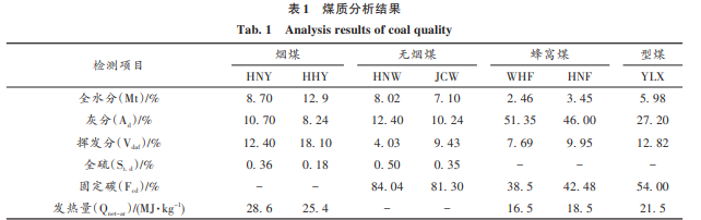 共選用 7 個煤種,包括 2 種煙煤、2 種無煙煤、2 種蜂窩煤和 1 種型煤。2 種煙煤分別來自河 南平頂山七礦(HNY)和陜西鴻海物流有限責任公司(HHY);2 種無煙煤分別來自平頂山天安煤業股份 有限公司(HNW)和山西晉城無煙煤礦業集團有限責任公司(JCW);2 種蜂窩煤分別來自武漢市售蜂窩 煤(WHF)和河南安陽蜂窩煤(HNF);型煤為陜西榆林煤球(YLX)。7 個煤種的煤質分析見表 1。表 1 中 煙煤和無煙煤的數據由煤種供應方提供,蜂窩煤和型煤數據按照GB/T 212—2008《煤的工業分析方法》[6] 和 GB/T 213—2008《煤的發熱量測定方法》[7]的規定測定。