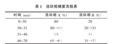 對(duì)照品的 制備: 稱取三七總皂苷對(duì)照品 63.01 mg, 配置時(shí)加 70%甲醇,溶解定容到 25 mL。 配置濃度:2.5 204 mg/ mL。 標(biāo) 示 含 量 :R1:7.4%、Rg1:26.3%、Re:3.7%、Rb1: 27.7%、Rd:7.6%。 供試品溶液的制備:稱取 30%乙醇洗脫部位凍干 粉末 50.7 mg,30%甲醇定容置至 25 mL, 超聲溶解, 有機(jī)系濾頭過濾,取續(xù)濾液進(jìn)樣 10 μL;稱取 70%乙 醇洗脫部位 50.3 mg, 甲醇定容置至 25 mL, 超聲溶 解,濾頭過濾,取續(xù)濾液進(jìn)樣 10 μL。 HPLC 色譜條件:色譜柱:Ecosil-C18 柱( 250 mm× 4.6 mm,5 μm) ;流 速:1.0 mL/min;柱 溫:30 ℃;進(jìn) 樣 量:10 μL;檢測(cè)波長(zhǎng):203 nm;流動(dòng)相:乙腈-水溶液, 按表 1 進(jìn)行梯度洗脫[7]。