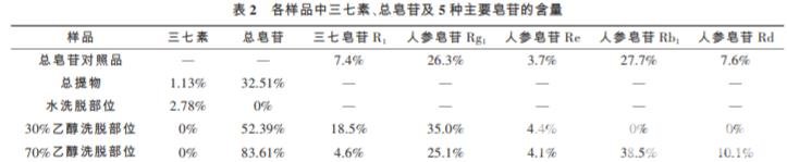對(duì)三七總提物和 各劃段樣品進(jìn)行了三七素含量檢測(cè)。 結(jié)果顯示,總提 物和水洗脫部位中含有三七素,含量分別為 1.13%和 2.78%。30%和 70%乙醇洗脫部位均未檢測(cè)到三七素。如表 2 所示。