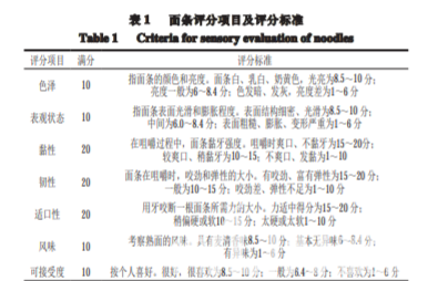 參照SB/T 10139—1993《饅頭用小麥粉》主要評價 指標對面條的顏色、表觀狀態、咀嚼性、彈性等7 個評分項目進行評價,滿分為100 分。挑選10 個愛吃面條且具 有一定專業知識的人員組成感官評定小組,對添加不同比 例的LOX面條進行感官評定,最后將小組評定結果的平均 分作為最終得分。面條評分項目及評分標準如表1所示。