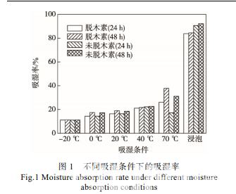 不同吸濕條件下的吸濕率見圖 1。由圖 1 可知, 隨著溫度升高,對應的飽和濕度增加,材料吸水率增 加。根據圖 1 結果,設定脫木素材料的含水率為 0, 5%,10%,20%,40%,60%,80%和 84%,共 8 個 梯度;設定未脫木素材料的含水率為 0,5%,10%,20%,40%,60%,80%和 90%,共 8 個梯度。