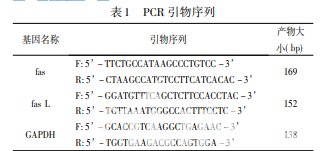 平目湯,由黃芪 30 g,淫羊藿 15 g,川芎 15 g,白芥子 15 g,炙鱉甲 15 g,車前子( 包煎) 30 g 組成,由 上海中醫(yī)藥大學(xué)附屬龍華醫(yī)院中藥房制備成水煎劑( 生藥 含量為 4 g /mL) ,4 ℃保存。 Trizol Reagent,Life Technologies Corporation 公 司; DEPC( RNA 酶抑制劑) ,Sigma - Aldrich - Life Science 公 司; 無(wú)水乙醇、75% 乙醇、異丙醇、氯仿、十二烷基硫酸鈉 ( SDS) ,國(guó)藥集團(tuán)化學(xué)試劑有限公司; 逆轉(zhuǎn)錄試劑盒( GoScripTM Reverse Transcription System) ,Promega 公司; 臺(tái)盼藍(lán) 染液、One cell 細(xì)胞計(jì)數(shù)板,上海魯汶生物科技有限公司; 引物合成,上海閃晶分子生物科技有限公司; Fas 抗體、Fas L 抗體,美國(guó) abcam 公司; GAPDH 單克隆抗體,美國(guó) CST 公 司; 辣根過(guò)氧化物酶標(biāo)記的二抗,美國(guó) Jackson ImmunoResearch 公司; 生理鹽水,上海長(zhǎng)征富民金山制藥有限公司; Protein Marker ( PageRulerTMPlusPrestaind Protein) ,Thermo Fisher Scientific 公司; 蛋白酶抑制劑,Roche Diagnostics 公 司; 微量 BCA 蛋白定量試劑盒,康為世紀(jì)公司; 20% SDS solution、Tris - Hcl Buffer( pH 為 6. 8) 、40% 丙烯酰胺( 40% Acr) 、四甲基二乙胺( TEMED) ,BIO - RAD 公司; Tris - Hcl Buffer( pH8. 8) ,北京索萊寶( Solarbio) 科技有限公司; SDS - PAGE 上樣緩沖液( 5 × ) ,碧云天生物技術(shù)研究所; 甘氨 酸( MW75. 07) 、Tween 20,SIGMA - ALDRICH 公司; 氨基 丁三醇( Tris) ( MW121. 14) ,Sigma 公司; 硝酸纖維素膜 ( PVDF 膜) ,Millipore 公司; 麗春紅染色試劑,康為世紀(jì)公 司; 脫脂奶粉( 國(guó)產(chǎn)伊利牌) ,內(nèi)蒙古伊利實(shí)業(yè)集團(tuán)有限公 司; 顯影劑試劑盒( Immobilon Western 化學(xué)發(fā)光底物) ,Millipore 公司; 胎牛血清,Biowest; DMEM 培養(yǎng)基,上海立菲生 物技術(shù)有限公司( life technologise) 。基因序列通過(guò) GenBank 獲得,由上海閃晶分子生物科技有限公司設(shè)計(jì)并合 成。引物序列見表 1。
