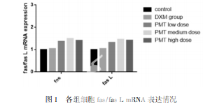 與空白 對(duì)照組相比,平目湯各組 fas、fas L 蛋白表達(dá)均上調(diào),差異有 統(tǒng)計(jì)學(xué)意義( P < 0. 05) ,地塞米松組無(wú)統(tǒng)計(jì)學(xué)差異( P > 0. 05) 。在升高 fas 表達(dá)方面,平目湯高劑量組與平目湯中 劑量組、平目湯低劑量組比較,差異有統(tǒng)計(jì)學(xué)意義( P < 0. 05) 。平目湯中劑量組與平目湯低劑量組比較,無(wú)統(tǒng)計(jì)學(xué) 差異( P > 0. 05) 。