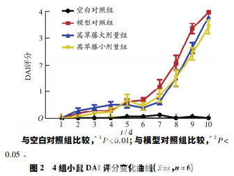 茜草藤對 DSS 誘導的 UC 小鼠 DAI 評 分見圖 2。空白對照組小鼠體質量有所增加,大便硬度 適中,黑褐色,橢圓形,無稀便及血便,故其 DAI 評分主 要是其體質量波動評分。模型對照組小鼠飲用 3%DSS4 d 后,大便性狀開始變化,先是成形大便,然后逐漸變 為稀松大便,甚至是水樣瀉,第 5 天部分小鼠出現血便, DAI 評分顯著升高; 茜草藤大、小劑量組小鼠在造模后 也出現體質量降低、大便性狀改變,以及腹瀉、血便等癥 狀,但癥狀明顯比模型對照組輕。與空白對照組比較, 模型對照組小鼠在第 5 天 DAI 評分均顯著升高,差異有 統計學意義( P<0.01) ,茜草藤大、小劑量組 DAI 評分也 升高,但造模后 DAI 評分均低于模型對照組,第 6 天 DAI 評分顯著低于模型對照組( P<0.05) 。