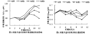 在本試驗(yàn)中,香蕉表現(xiàn)出的冷害癥狀有:外果皮變 暗變黑,果肉變軟,到后期果實(shí)內(nèi)部出水漬,不可食用; 但經(jīng)過(guò)間歇升溫處理的果實(shí),有部分雖果皮已變黑,香 蕉的頭部和根部也變軟,但其果肉大部分保存較好。通 過(guò)試驗(yàn)得知,間歇升溫處理對(duì)香蕉冷害有較好的抑制 作用,可以有效地保持香蕉果實(shí)的硬度,減少纖維素含 量和酚類(lèi)物質(zhì)的消耗,延緩纖維素酶、PPO 及 POD 的 活性,減少 MDA 含量,從而達(dá)到預(yù)防香蕉冷害的效 果,延緩其衰老。特別是間歇升溫至 14℃保持 2d 此種 方式對(duì)預(yù)防香蕉冷害效果更為明顯,有利于維持營(yíng)養(yǎng) 價(jià)值和貯藏品質(zhì),延長(zhǎng)貨架期。