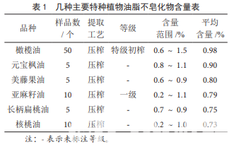 幾種主要特種植物油脂不皂化物含量結(jié)果見表 1,其 中橄欖油的不皂化物平均含量最高為 0.98%,核桃油的最 低為 0.73%。分析結(jié)果表明,橄欖油(0.6% ~ 1.5%)、 亞麻籽油(0.2% ~ 1.1%)、核桃油(0.2% ~ 1.0%)等不 皂化物含量波動范圍較大,元寶楓油、美藤果油和長柄扁 桃油等不皂化物含量波動范圍相對較小,推斷其與不同 原料產(chǎn)地和樣品品種有關(guān)。